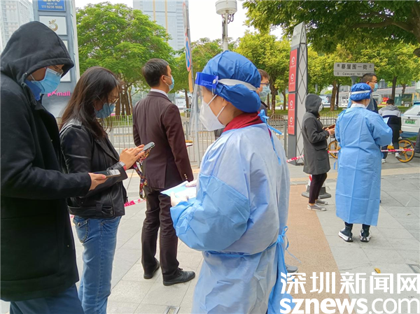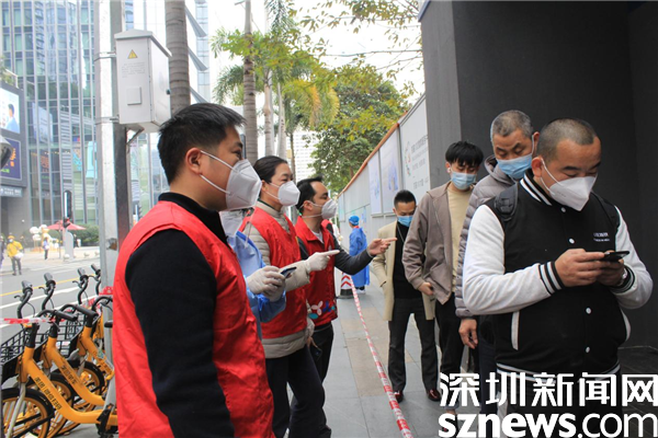 1月14日,深圳市京基智農(nóng)時(shí)代股份有限公司總部黨支部黨委副書記張玲帶領(lǐng)5位黨員,火速來(lái)到禧程酒店臨時(shí)檢測(cè)點(diǎn),經(jīng)過(guò)簡(jiǎn)短的培訓(xùn),他們集體上崗,各就其位。有的維持秩序,有的在外圍協(xié)助查驗(yàn)綠碼,有的協(xié)助出示粵酸碼。黃子亮和彭乾偉穿上防護(hù)服,現(xiàn)學(xué)現(xiàn)做,使用自己的手機(jī)為前來(lái)采用的市民掃描粵酸碼。他們都是青壯年,雖然這是關(guān)鍵崗位,但他們一學(xué)就會(huì),很快上手。十人一管,掃碼上傳,有條不紊,忙而不亂。