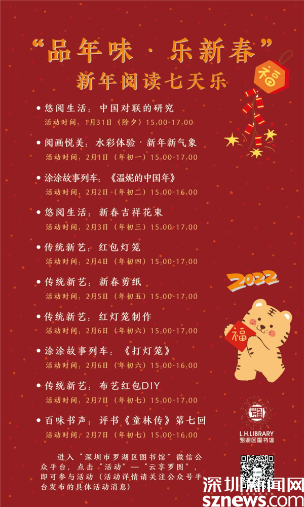 讀特客戶端·深圳新聞網(wǎng)2022年1月28日訊(記者 劉嘉敏 通訊員 張蕾)壬寅年春節(jié)將至,為了營造喜慶、歡樂、祥和的節(jié)日氛圍,羅湖區(qū)圖書館推出一系列豐富多彩的新春文化活動(dòng),讓留深讀者在新春佳節(jié)里盡享文化“大餐”。