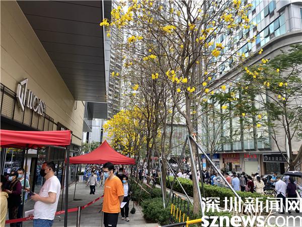 在國速中心廣場,黃花鈴木開得正好,藍(lán)天白云下是有序的核酸檢測隊伍,“大白”和“小藍(lán)”們正忙碌不停。據(jù)悉,這是桂園街道所屬的松園社區(qū)的一個核酸檢測點(diǎn),地處于商業(yè)旺區(qū)附近,人口較多,所以核酸檢測隊伍也相對其他核酸檢測點(diǎn)長。羅湖區(qū)政協(xié)委員、深圳市國速房地產(chǎn)開發(fā)有限公司董事長黃少兵表示,這個核酸檢測點(diǎn)從1月初就設(shè)立了,“由于國速中心廣場較寬敞,滿足了通風(fēng)和人流需求。”