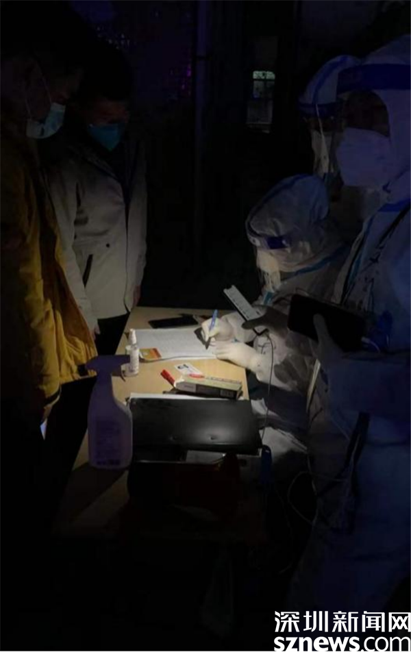 ▲臨時工作場所尚未配備照明設(shè)備,下沉干部打著手機(jī)閃光燈登記居民采樣信息
