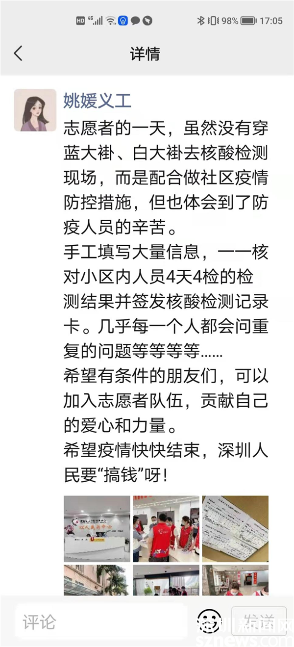 她在朋友圈呼吁:“希望有條件的朋友們,可以加入志愿者隊(duì)伍,貢獻(xiàn)自己的愛(ài)心和力量?!彼f(shuō),她所供職的優(yōu)合集團(tuán)已經(jīng)組織了122人的志愿隊(duì)伍,分布在全市各區(qū),奮力投身全市抗疫戰(zhàn)斗。雖然做志愿者很辛苦,但她不忘調(diào)侃:希望疫情快快結(jié)束,深圳人民要“搞錢(qián)”呀!