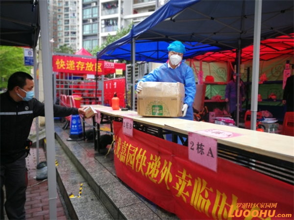 隨著快遞和線上訂菜數(shù)量增多,為了避免居民取快遞聚集以及與快遞員頻繁接觸,寶龍管理嘉園管理處決定在小區(qū)正門設(shè)立快遞外賣臨時存放點(diǎn),根據(jù)樓棟、物品類型等進(jìn)行分類,實(shí)行“無接觸”配送。存放點(diǎn)麻雀雖小,但五臟俱全:分別設(shè)有快遞消毒分揀區(qū)、郵寄快遞消毒交接區(qū)、消毒分類中轉(zhuǎn)區(qū)、快遞存放區(qū)、外賣(生鮮蔬菜快餐)存放區(qū)。