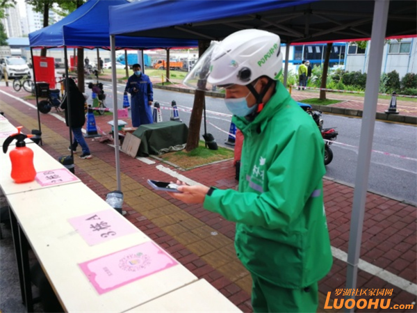 小區(qū)自建的快遞外賣臨時存放點(diǎn),是由物業(yè)與居民志愿者共同管理的,分揀員主要由物業(yè)人員和業(yè)主志愿者組成。分揀員穿上防護(hù)服與快遞、外賣小哥在郵寄快遞消毒交接區(qū)進(jìn)行交接,避免了所有人員與快遞、外賣小哥直接接觸,保持了有效的安全間隔。在臨時存放點(diǎn)可以看到由志愿者擔(dān)當(dāng)著分揀員,他們有條不紊、熟練地將快遞對應(yīng)放于相應(yīng)樓棟的貨架上。