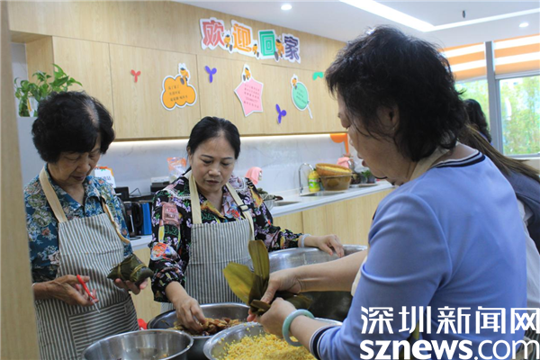 一起包粽子的30名“大廚”中,有社區(qū)居民,也有轄區(qū)企業(yè)員工。年齡最大的73歲,是老圍社區(qū)的蔡屋圍村民,年齡最小的25歲,是轄區(qū)企業(yè)員工。只見她們圍桌而立,雙手包著粽子,嘴里說著家常,臉上帶著笑,沒多大工夫,一個個有棱有角的粽子就在大盆里堆成了小山。每一顆粽子都有家的味道,都帶著滿滿的祝福和對美好生活的憧憬。不少居民在老圍社區(qū)出生長大,一住就是一輩子,她們見證了社區(qū)家園日新月異的變化,她們熱愛這塊土地,熱愛老圍社區(qū)。