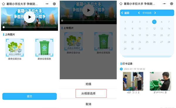需要注意的是,學(xué)生在上傳照片時,須上傳每日廚余分類和廚余投放照片,不可重復(fù)使用同一張照片進行打卡,當(dāng)日多次上傳照片僅記錄打卡簽到1次;此外,如上傳與廚余垃圾分類無關(guān)的照片,系統(tǒng)將自動作廢當(dāng)次打卡,判定該次打卡無效。