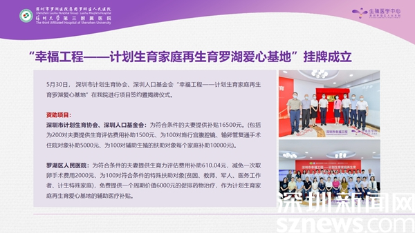 今年初,深圳市計劃生育協(xié)會、人口基金會就創(chuàng)建了一項“幸福工程”,旨在為計劃生育家庭再生育提供幫助。今年5月30日,第一個幸福工程基地就選擇坐落于羅湖醫(yī)院,項目為符合條件的夫妻提供總額高達(dá)16500元的醫(yī)療補貼,同時,羅湖醫(yī)院還給予相應(yīng)的醫(yī)療減免,包括手術(shù)及藥品費用的配套補貼。為居民再生育提供了很好的幫助,大大降低了經(jīng)濟(jì)壓力,讓更多的家庭愿意再生育。