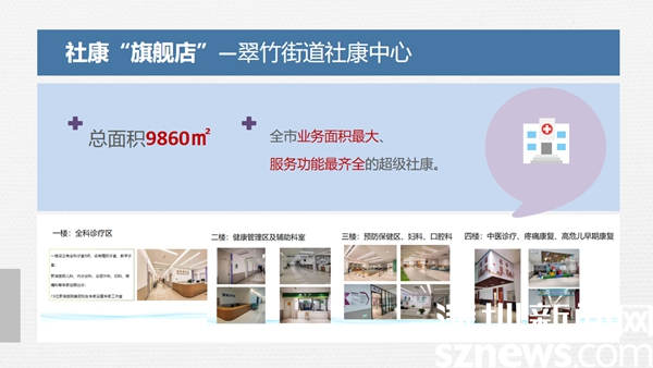 2021年3月,全市業(yè)務(wù)面積最大、服務(wù)功能最齊全的羅湖醫(yī)院集團(tuán)翠竹街道社康中心投入使用??偯娣e9860平方米共有4層,分設(shè)不同功能區(qū)。一樓為診療區(qū),涵蓋全科診療區(qū)、專家工作室、醫(yī)學(xué)影像檢查區(qū)等;二樓為健康管理區(qū),為居民提供全周期的健康體檢及檢后健康管理服務(wù),還設(shè)有超聲、檢驗、DR等科室;三樓為預(yù)防保健區(qū),口腔科、婦科,四樓為高危兒早期康復(fù)中心、名中醫(yī)館、中醫(yī)康復(fù)理療區(qū)。