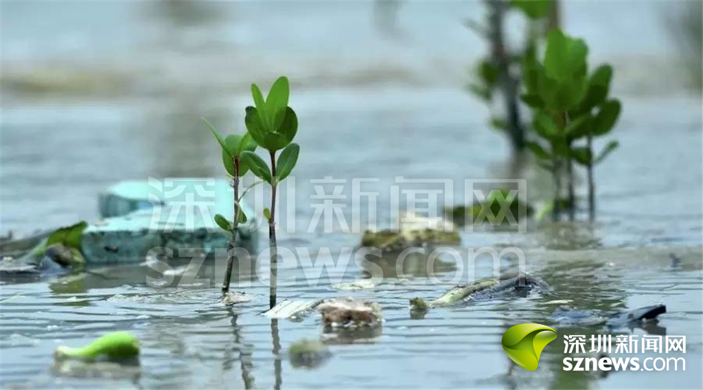 成長中的紅樹苗受海洋垃圾覆蓋,成活困難