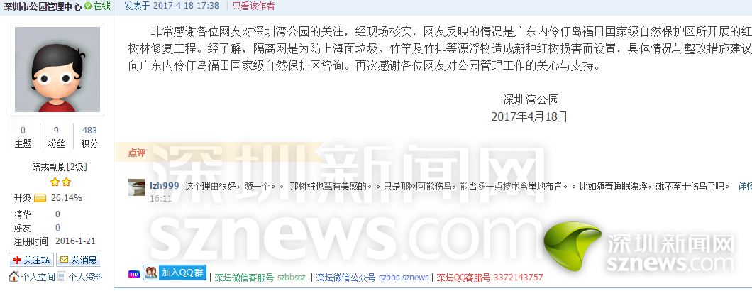 4月18日下午17:38分,深圳灣公園在深圳新聞網深圳論壇回應了網友的問題,并感謝網友對公園管理工作的關心和支持。