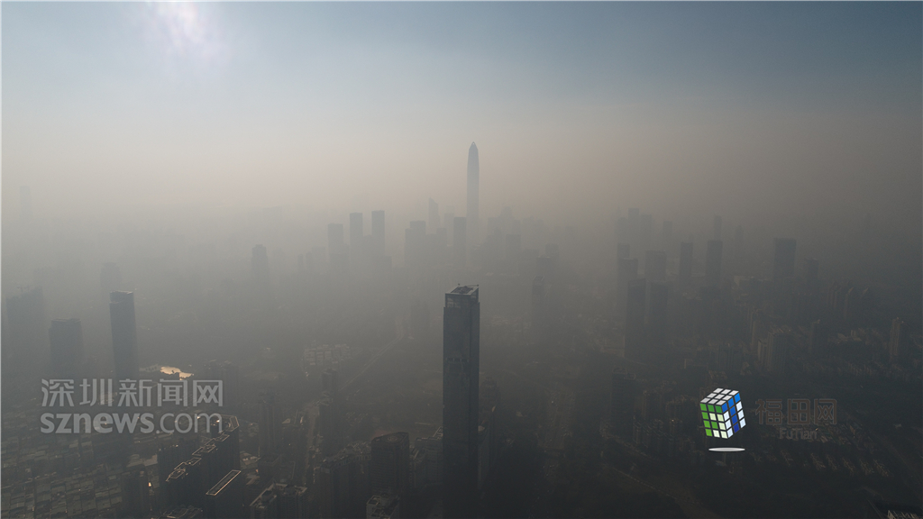 1月18日上午,記者操控?zé)o人機(jī)俯瞰深圳中心區(qū)發(fā)現(xiàn),灰霾將天空“割裂”成一道涇渭分明的界線,把城市籠罩得如同一個充滿霧靄的森林。從平安金融大廈的上空遠(yuǎn)眺,西南面的深圳灣在灰霾的籠罩下變成了一片“沙漠”,東面的京基一百幾乎被灰霾“吞沒”,北邊平時肉眼可看的梅林山也因為能見度較低變得若隱若現(xiàn),南面的米埔濕地也被云遮霧繞。