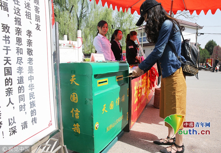 在鳳棲山人文紀(jì)念園,擺放了一個巨大的“天國信箱”。如果前來祭掃的市民有對逝去親人想說的話,想表達(dá)的哀思,可以寫一封信,投入天國信箱。憑著寫給親人的信,祭奠者可在墓園領(lǐng)到一枝鮮花和一條絲帶,然后帶入墓園紀(jì)念自己的親人。