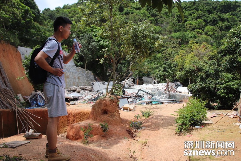 5月16日,深圳新聞網(wǎng)記者爬上羊臺山,用無人機(jī)和相機(jī)拍下羊臺山毀林案件涉案的兩棟違法建筑拆除后的情景。記者從羊臺山隱蔽的一處登山,山路崎嶇且陡峭,沿路都是荔枝林,多頭大型犬見到陌生人狂吠不已。耗時三四十分鐘登臨山腰,可俯瞰西麗水庫,視野極佳。
