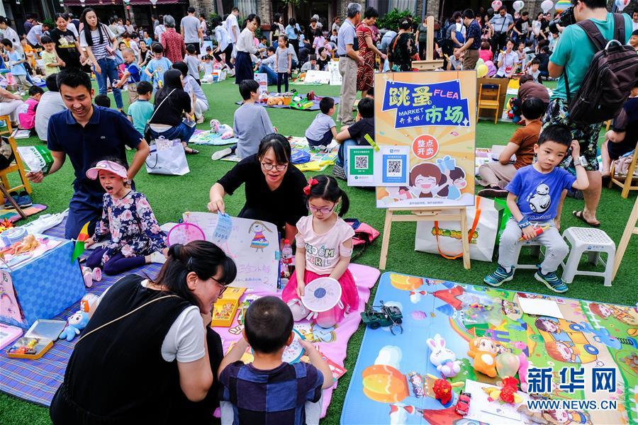 6月4日,孩子和家長(zhǎng)們?cè)谛@“跳蚤市場(chǎng)”中買(mǎi)賣(mài)玩具和書(shū)籍。