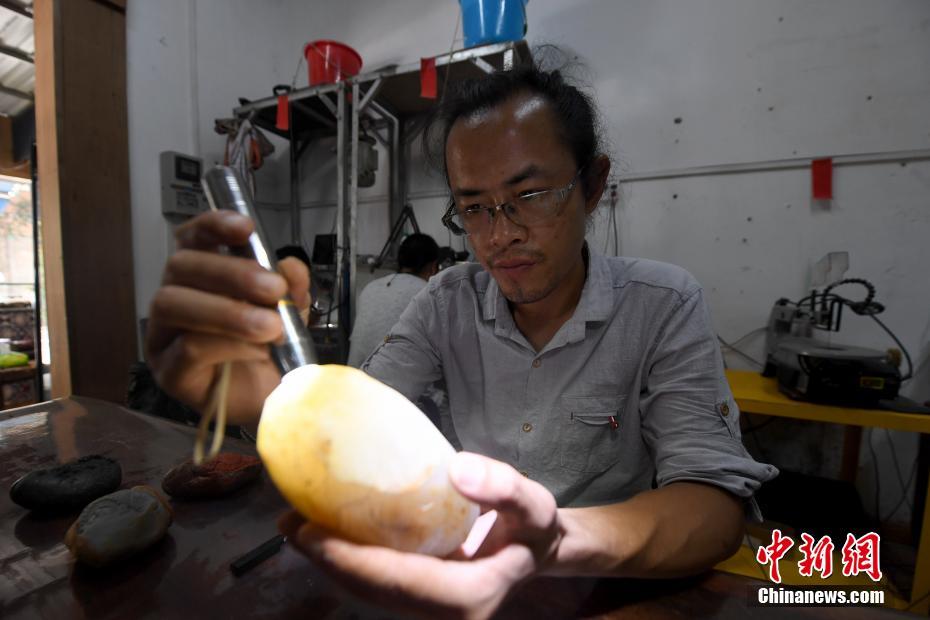 6月20日,廣西南寧市唐人文化街,錢思宇正在審料。1984年的錢思宇出生于湖南懷化,自小喜愛(ài)把玩石頭,受父輩影響,從2012年開(kāi)始從事玉石雕刻工作至今。據(jù)了解,其設(shè)計(jì)的壯鄉(xiāng)玉雕作品,以人物為主,采用廣西當(dāng)?shù)靥赜械氖?,結(jié)合壯文化中的銅鼓、壯錦等元素,通過(guò)刻畫“壯鄉(xiāng)人”的神態(tài),表達(dá)廣西特有的“壯鄉(xiāng)情”。中新社記者 俞靖 攝