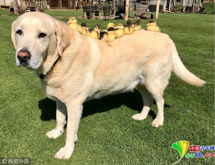 2018年5月22日訊(具體拍攝時間不詳),英國艾塞克斯郡芒特菲奇特城堡,一只名為弗雷德的拉布拉多和它“收養(yǎng)” 的9只小鴨子。小鴨子的媽媽突然失蹤,10歲的弗雷德就成了它們的“新爸爸”。