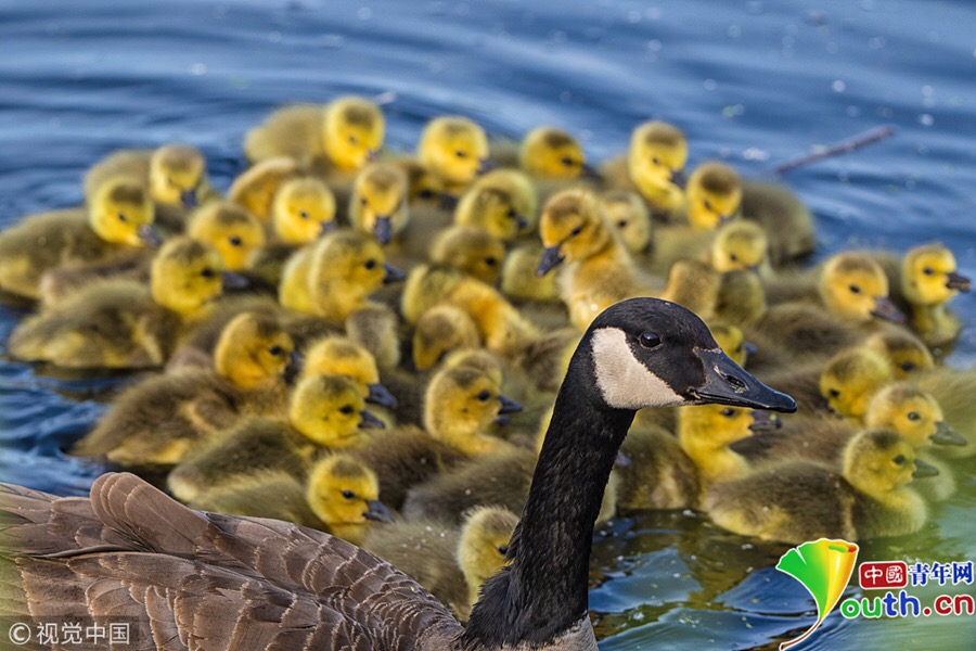 這只加拿大鵝和它的伴侶幫初次當(dāng)父母的同伴照看小孩,幼鵝們整齊劃一的樣子十分可愛,似幼兒園春游。