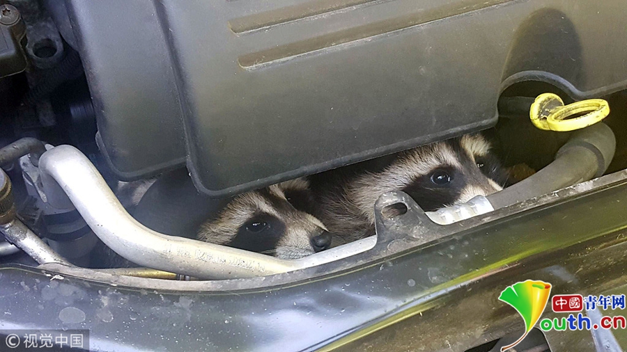 六只浣熊寶寶藏在汽車引擎中。圖片作者/視覺中國