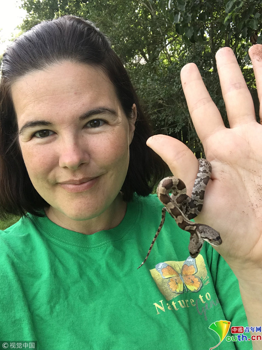 野生動(dòng)物專(zhuān)家Tanee Janusz收養(yǎng)了同事在后院發(fā)現(xiàn)的一只雙頭錦蛇。圖片來(lái)源:視覺(jué)中國(guó)