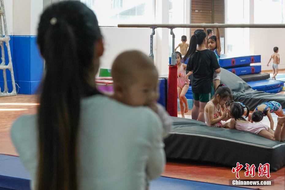 7月16日,貴州榕江,一位母親抱著孩子在訓(xùn)練室門外看著孩子們訓(xùn)練。位于月亮山深處的貴州省黔東南苗族侗族自治州榕江縣,數(shù)十年來堅(jiān)持少年兒童體操培養(yǎng)、訓(xùn)練,對(duì)于全縣有良好身體條件的少年兒童進(jìn)行免費(fèi)集中培訓(xùn)。目前該縣每年有60余名兒童在業(yè)余體操運(yùn)動(dòng)學(xué)校進(jìn)行訓(xùn)練。炎炎夏日,孩子們不懼酷暑,刻苦訓(xùn)練追尋著自己的“體操夢(mèng)”。據(jù)了解,自1972年以來,榕江縣先后向貴州省體操隊(duì)、蹦床隊(duì)輸送了21名運(yùn)動(dòng)員;其中有6名運(yùn)動(dòng)員進(jìn)入國家體操隊(duì),10名運(yùn)動(dòng)員榮獲“國家健將級(jí)運(yùn)動(dòng)員”稱號(hào),5名運(yùn)動(dòng)員榮獲“國際健將級(jí)運(yùn)動(dòng)員”稱號(hào),其中體操名將劉榕冰是2014年體操世錦賽男團(tuán)冠軍成員之一。2004年,榕江縣被貴州省體育局授予“貴州體操之鄉(xiāng)”稱號(hào)。中新社記者賀俊怡 攝