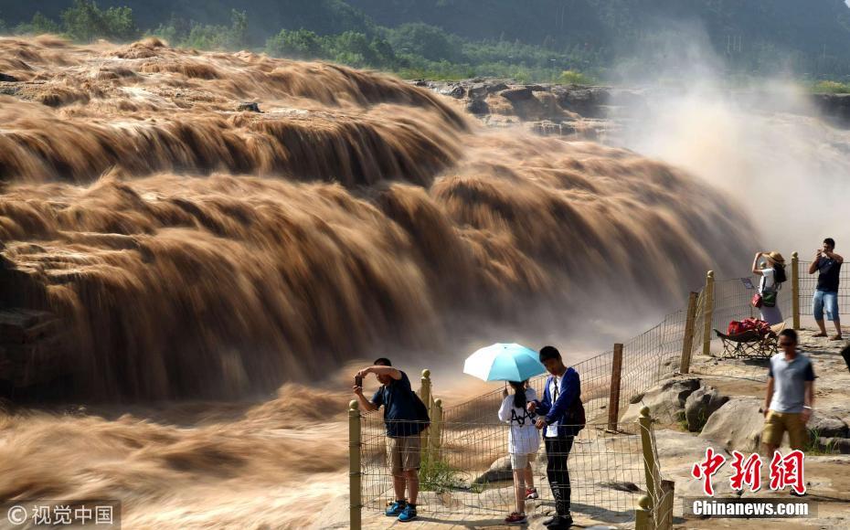 7月17日,山西臨汾,游客在黃河壺口瀑布游覽觀瀑。進入7月主汛期,受黃河上游降雨量增多影響,位于山西吉縣和陜西宜川縣交界的黃河壺口瀑布水量暴漲。濁浪滔天的壯美瀑布群景觀,吸引了眾多游客。呂桂明攝 圖片來源:視覺中國