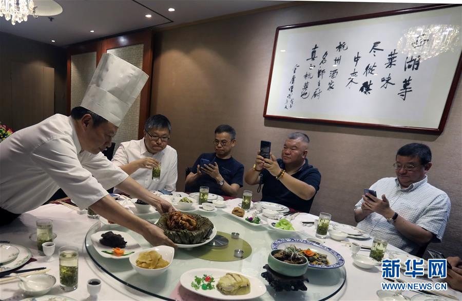 杭州酒家老板吳瑞康為客人端上自己親自制作的“叫化雞”(6月16日攝)。 金庸在武俠小說《神雕俠侶》中借郭靖之口說過: “為國為民,俠之大者。”武俠精神在香港備受推崇,有其心向中華文化的情感基礎(chǔ)。在這個國際美食之都,品味舌尖上的武俠味,內(nèi)中的感覺別有深意。新華社記者 李鵬 攝
