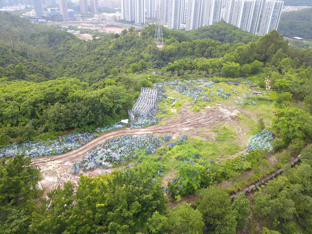 從航拍圖中可以看到,山頂空地上單車眾多,顏色也各不相同