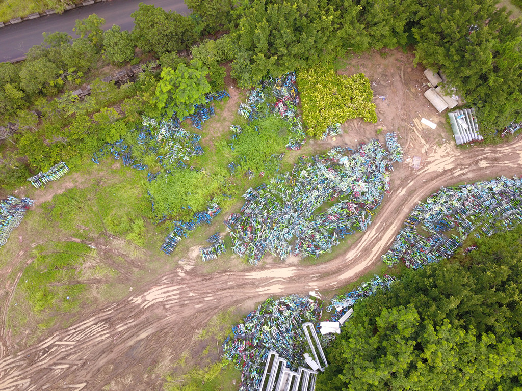 從高空俯瞰,安托山山頂?shù)墓蚕韱诬?chē)堆積無(wú)序、且周?chē)s草叢生,猶如一片共享單車(chē)“墳場(chǎng)”