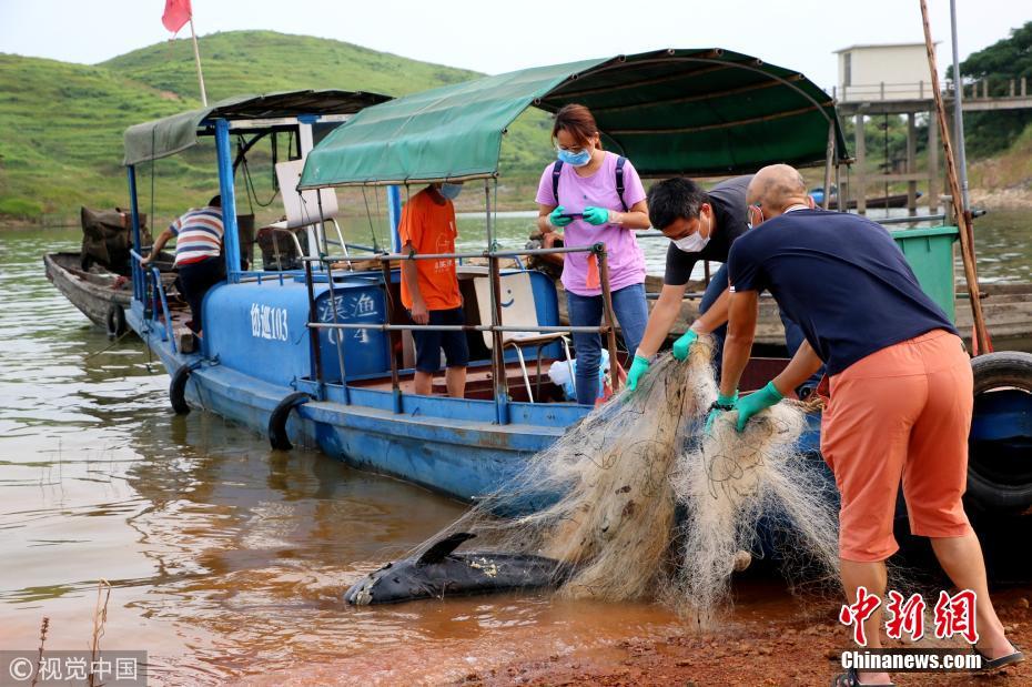 8月1日早晨,濂溪區(qū)護(hù)豚隊(duì)接到漁民打來(lái)的電話,在湖口縣鄱陽(yáng)湖的屏峰水域,發(fā)現(xiàn)水中絲網(wǎng)里有一頭江豚,懷疑已死亡。接到電話后,正在芳蘭湖清理水中定制網(wǎng)的濂溪區(qū)護(hù)豚隊(duì)隨即趕到現(xiàn)場(chǎng)。護(hù)豚隊(duì)隊(duì)員趕到現(xiàn)場(chǎng)時(shí)看到,事發(fā)地點(diǎn)距離岸邊約30米,一頭大江豚全身被水中的絲網(wǎng)纏住,無(wú)法動(dòng)彈。見(jiàn)此情況,大家將渾身纏滿(mǎn)絲網(wǎng)的江豚連網(wǎng)一起運(yùn)至岸邊,同時(shí)與中科院武漢水生生物所取得聯(lián)系。洪永林 攝 圖片來(lái)源:視覺(jué)中國(guó) 文字來(lái)源:九江新聞網(wǎng)
