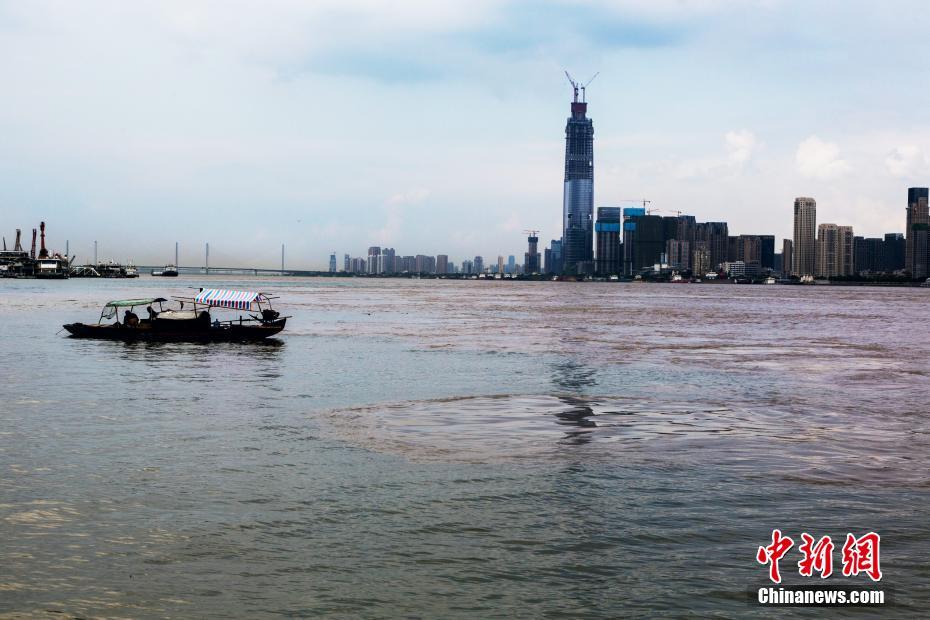 7月14日,一艘漁船停在長(zhǎng)江和漢江交匯處,從漢陽(yáng)南岸嘴望去漢江(左)與長(zhǎng)江(右)“涇渭分明”。中新社記者 張暢 攝