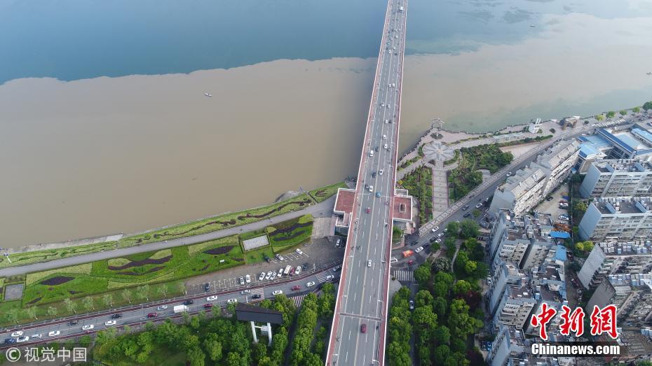 5月7日,湖北省襄陽(yáng)市,無(wú)人機(jī)航拍的漢江長(zhǎng)虹大橋處涇渭分明的漢江水面。強(qiáng)暴雨沖刷經(jīng)過(guò)去冬今春的田野地表積累的塵土,經(jīng)支流與主河道匯入時(shí),充滿污泥的洪水與主河道上清澈的丹江水形成難得一見(jiàn)的涇渭分明景觀。王虎攝 圖片來(lái)源:視覺(jué)中國(guó)
