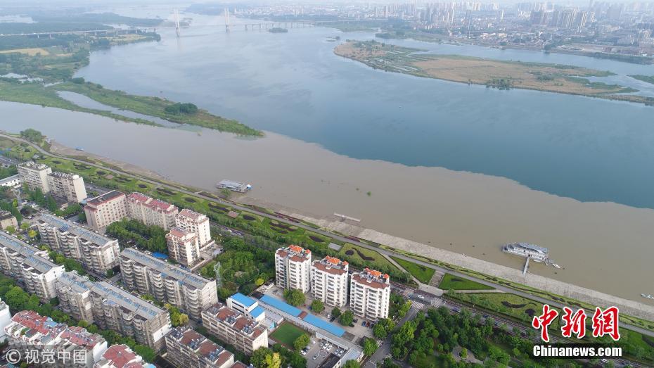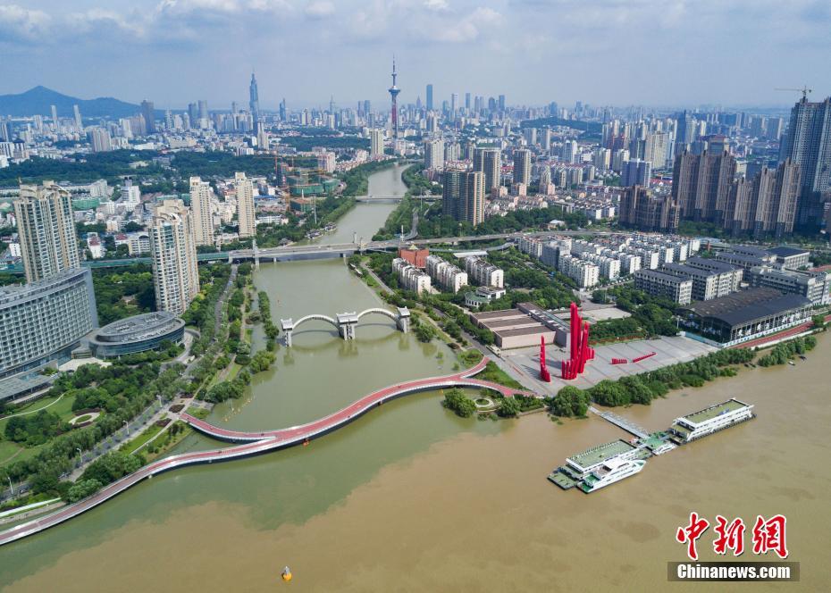 7月10日,航拍長(zhǎng)江與南京秦淮河交匯處,江水與河水“涇渭分明”。當(dāng)日,江蘇水利廳發(fā)布的水情信息顯示,長(zhǎng)江南京段水位已降至警戒線以下。中新社記者泱波 攝