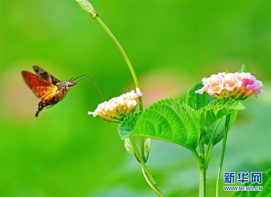在福建省福州市溫泉公園,透翅天蛾在花間飛舞(8月18日攝)。近日,福建省福州市溫泉公園內(nèi)的馬纓丹大面積開放?;t、草綠、蟲飛,構(gòu)成了一幅和諧的閩都生態(tài)圖景。 新華社記者梅永存攝