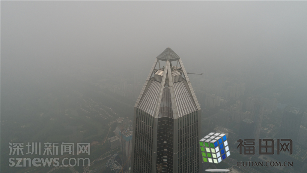 記者在福田中心區(qū)看到,大量的灰霾籠罩在城市上空,不少著名的地標(biāo)性高樓大廈玩起了“隱身術(shù)”。比如,平安金融中心大廈若隱若現(xiàn),在上午11時、下午4時等灰霾最嚴(yán)重時候甚至完全看不見。記者操作無人機航拍福田中心區(qū)的灰霾情況,在海拔500米左右的高空,無人機的視線就被灰霾完全擋住。距離不足一百米的平安金融中心都看不見任何蹤影。