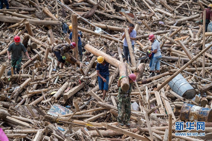 9月4日,當(dāng)?shù)厝罕娫诼槔跗驴h猛硐瑤族鄉(xiāng)壩子橋區(qū)域清理河道內(nèi)堆積的木材。當(dāng)日,云南麻栗坡山洪泥石流災(zāi)害救援工作繼續(xù)開展,救援人員在現(xiàn)場全力搜尋失蹤人員。新華社發(fā)方超 攝 圖片來源:新華網(wǎng)