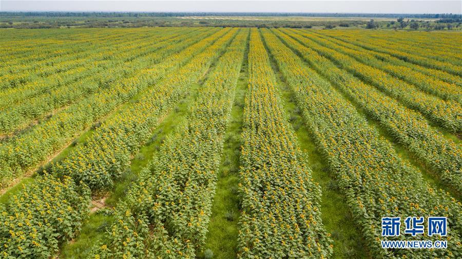 內(nèi)蒙古達(dá)拉特旗白土梁林場的沙棘葵花套種田(8月1日無人機(jī)拍攝)。 新華社記者張善臣攝