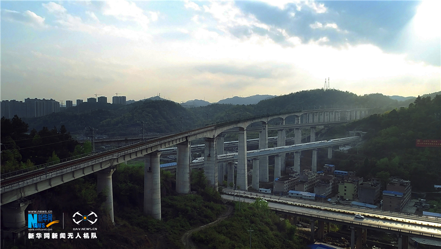 貴州省地處中國西南腹地,全省高原山地居多,因此高鐵建設(shè)的橋隧占比較高。在貴陽市烏當(dāng)區(qū)新添寨,高鐵滬昆線、貴廣客運專線、貴開城際客運專線的隧道和橋梁交織在一起,形成“五洞五橋”并行,形似“五龍出海”的壯觀景象。圖為3月29日,新華網(wǎng)無人機航拍兩輛動車在線路上會車。新華網(wǎng)周遠(yuǎn)鋼 攝