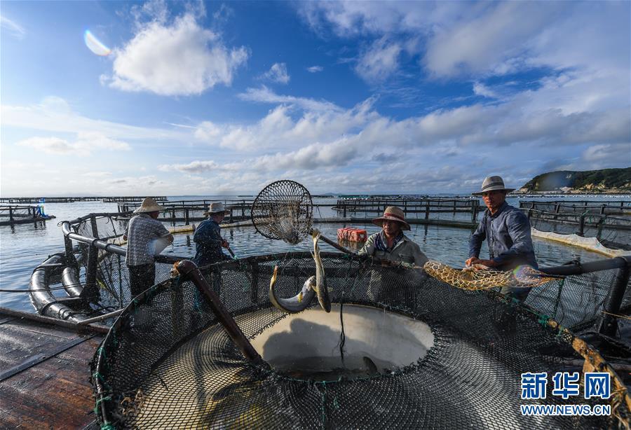 8月18日,南麂島海域內(nèi)的“海上牧場”養(yǎng)殖區(qū)內(nèi),漁民正捕撈大黃魚,處于仿生養(yǎng)殖環(huán)境的大黃魚需要生長2至3年。進入8月,浙江省溫州市平陽縣南麂鎮(zhèn)海域上大片的大黃魚、貽貝等特色海產(chǎn)品養(yǎng)殖區(qū)域迎來豐收季節(jié),養(yǎng)殖戶們駕駛漁船在養(yǎng)殖區(qū)海域進行打撈收獲,在碧海藍天下構(gòu)成了一幅“海上牧場”的美麗豐收景象。近年來,南麂鎮(zhèn)政府引導(dǎo)漁民養(yǎng)殖戶充分發(fā)揮“靠海吃?!钡馁Y源優(yōu)勢,大力發(fā)展海洋養(yǎng)殖經(jīng)濟和海島旅游經(jīng)濟,實現(xiàn)了南麂由“生態(tài)美”向“產(chǎn)業(yè)美”,“產(chǎn)業(yè)美”向“經(jīng)濟美”的轉(zhuǎn)變。同時該鎮(zhèn)堅持以大黃魚、貽貝等為特色產(chǎn)業(yè)支撐,精準(zhǔn)發(fā)展高效海洋養(yǎng)殖業(yè),重點培養(yǎng)一批新型職業(yè)漁民,依靠專業(yè)技術(shù)支持,實現(xiàn)深海仿生養(yǎng)殖,讓好生態(tài)造就好品質(zhì),重點打造南麂養(yǎng)殖品牌,組建營銷網(wǎng)絡(luò),拓展特色海產(chǎn)品市場。新華社記者 徐昱攝