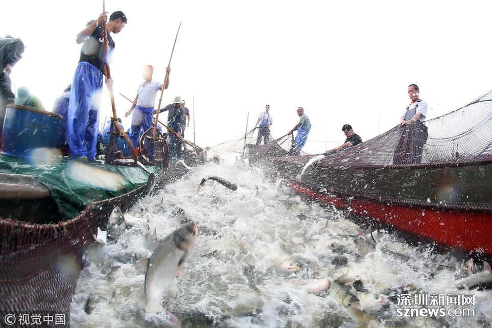 2018年6月26日,江蘇省常州市嘉澤鎮(zhèn)捕撈村的漁民組織夏季捕撈,一網(wǎng)魚達(dá)五萬余斤,以鰱魚為主,供應(yīng)市場需求。夏捕的魚價較平時有所上漲,漁民粗略估計可增收上萬余元。