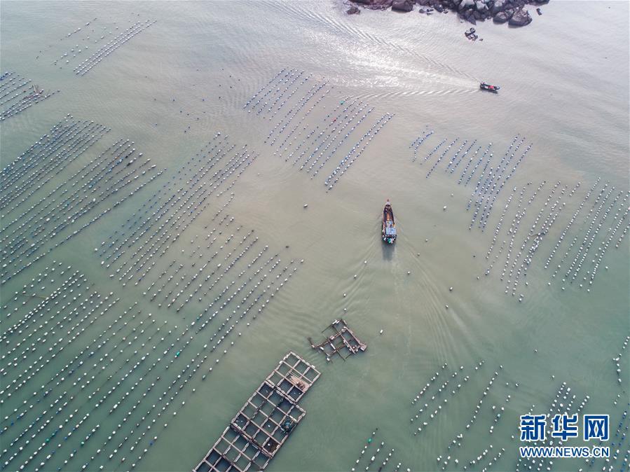 8月19日,空中俯瞰南麂島海域內(nèi)的“海上牧場”養(yǎng)殖區(qū)(無人機(jī)拍攝)。進(jìn)入8月,浙江省溫州市平陽縣南麂鎮(zhèn)海域上大片的大黃魚、貽貝等特色海產(chǎn)品養(yǎng)殖區(qū)域迎來豐收季節(jié),養(yǎng)殖戶們駕駛漁船在養(yǎng)殖區(qū)海域進(jìn)行打撈收獲,在碧海藍(lán)天下構(gòu)成了一幅“海上牧場”的美麗豐收景象。近年來,南麂鎮(zhèn)政府引導(dǎo)漁民養(yǎng)殖戶充分發(fā)揮“靠海吃?!钡馁Y源優(yōu)勢,大力發(fā)展海洋養(yǎng)殖經(jīng)濟(jì)和海島旅游經(jīng)濟(jì),實現(xiàn)了南麂由“生態(tài)美”向“產(chǎn)業(yè)美”,“產(chǎn)業(yè)美”向“經(jīng)濟(jì)美”的轉(zhuǎn)變。同時該鎮(zhèn)堅持以大黃魚、貽貝等為特色產(chǎn)業(yè)支撐,精準(zhǔn)發(fā)展高效海洋養(yǎng)殖業(yè),重點培養(yǎng)一批新型職業(yè)漁民,依靠專業(yè)技術(shù)支持,實現(xiàn)深海仿生養(yǎng)殖,讓好生態(tài)造就好品質(zhì),重點打造南麂養(yǎng)殖品牌,組建營銷網(wǎng)絡(luò),拓展特色海產(chǎn)品市場。新華社記者 徐昱攝