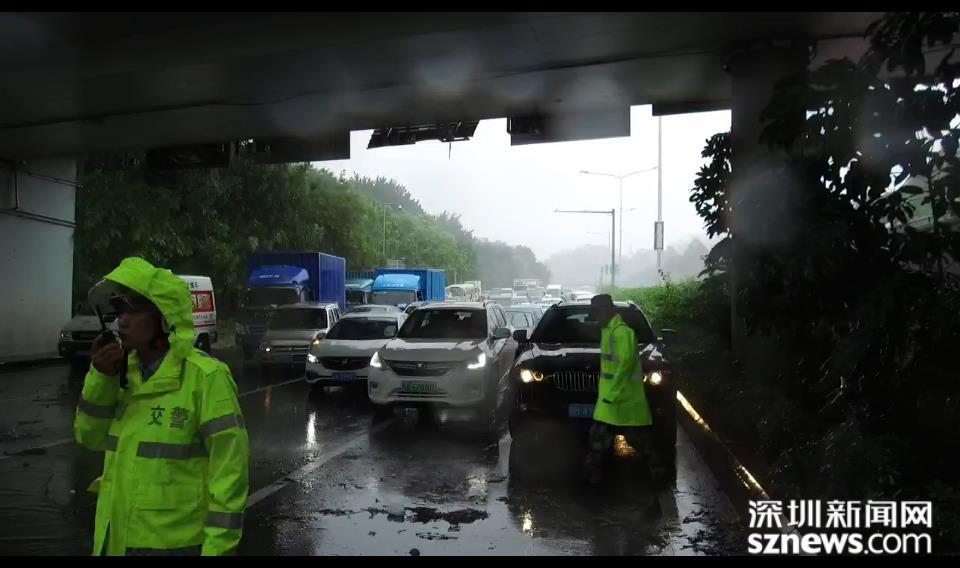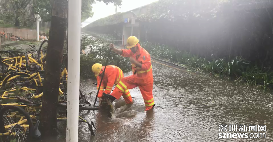 福田區(qū)位于北環(huán)皇崗立交,深圳市水務(wù)集團(tuán)福田分公司梅林所防洪排澇人員,趁風(fēng)勢(shì)雨小,打開雨水箅子排積水。