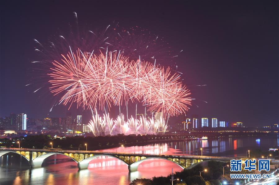 9月19日晚,湖南省長沙市在湘江橘子洲舉辦焰火晚會,絢麗的焰火與湘江兩岸的城市夜景交相輝映。