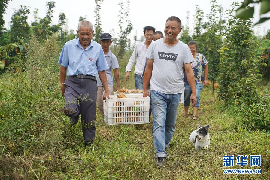 9月16日,小崗村梨園公社種植基地負責人黃慶昶(前右)與村民一同采摘“大吉梨”。新華社記者才揚攝