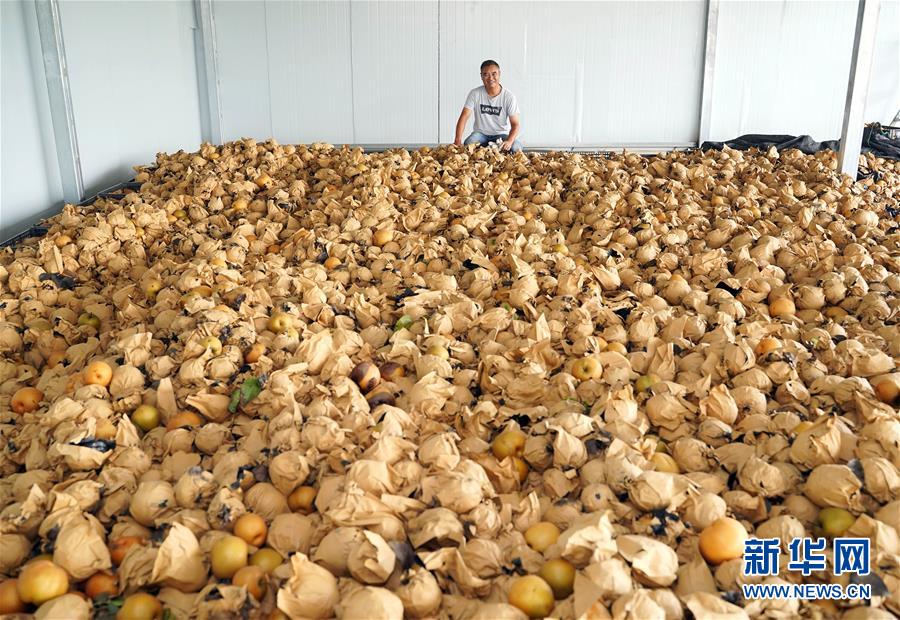 9月16日,在小崗村梨園公社種植基地,負(fù)責(zé)人黃慶昶與在網(wǎng)上電商平臺(tái)已售出即將裝箱的“大吉梨”合影。新華社記者才揚(yáng)攝