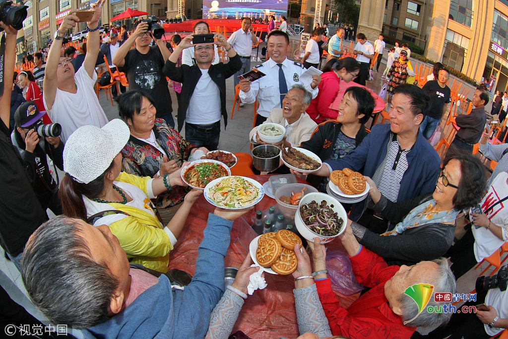 2018年9月23日,居民們在山東省乳山市金鼎銀龍灣廣場參加“百家宴”。