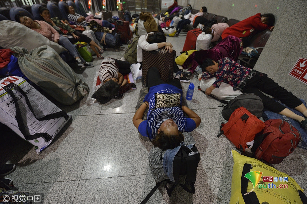 2018年9月15日,在鄭州火車站候車大廳,來自周口西華縣農(nóng)村的數(shù)百名采棉工,為趕早上4點50分的火車,在火車室打地鋪休息。