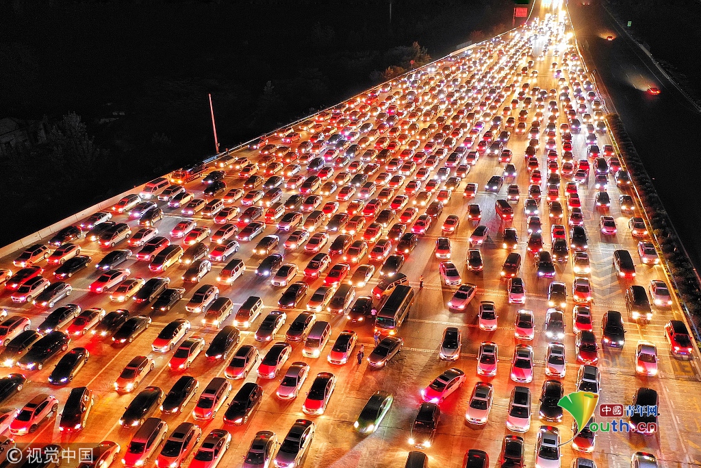 從天上鳥(niǎo)瞰,車(chē)輛的尾燈宛若一條紅色的巨龍,望不到盡頭,場(chǎng)面十分壯觀。