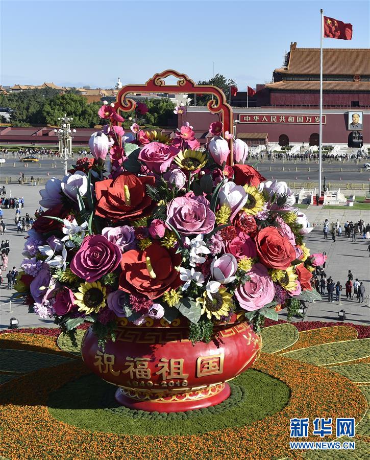 當(dāng)日,“祝福祖國(guó)”巨型花籃在北京天安門廣場(chǎng)全面亮相。據(jù)了解,從2011年開始,“祝福祖國(guó)”巨型花籃一直作為天安門廣場(chǎng)中心花壇的主景在國(guó)慶節(jié)期間向祖國(guó)獻(xiàn)禮。今年花籃內(nèi)布置有紅掌、梅花、康乃馨、向日葵、蘭花、月季等多種仿真花卉,寓意幸福吉祥。 新華社記者 李賀 攝