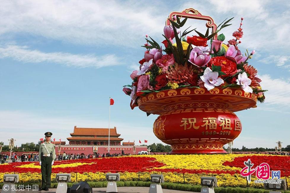 2016年天安門廣場大花籃籃體設(shè)計參考了清代畫家丁亮光“四季花籃”的畫作,花壇高17米,籃體高15.3米,直徑50米?;@中花材以牡丹、玉蘭、荷花、月季為主,配以“梅、蘭、竹、菊”等,籃體鑲嵌“祝福祖國”及“歡度國慶”文字以及1949-2016年號,表達對祖國繁榮富強、欣欣向榮的美好祝福。