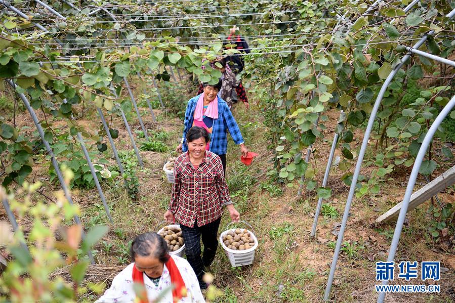 9月25日,在肥西縣銘傳鄉(xiāng)劉老圩獼猴桃種植基地,農(nóng)民搬運剛采摘的獼猴桃。 新華社記者劉軍喜攝