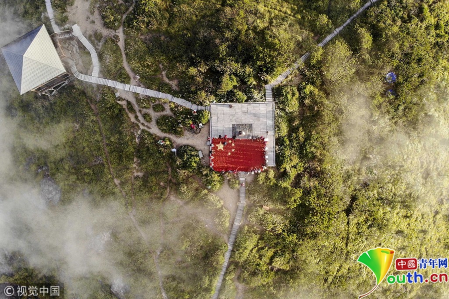 9月26日,長(zhǎng)三角第一高峰浙江龍泉山農(nóng)作物喜獲豐收,當(dāng)?shù)剞r(nóng)民與游客用8噸剛收獲的辣椒以及玉米,在山頂?shù)脑坪V衅闯隽艘幻骈L(zhǎng)10米、寬6.6米的巨型國(guó)旗慶祝豐收。
